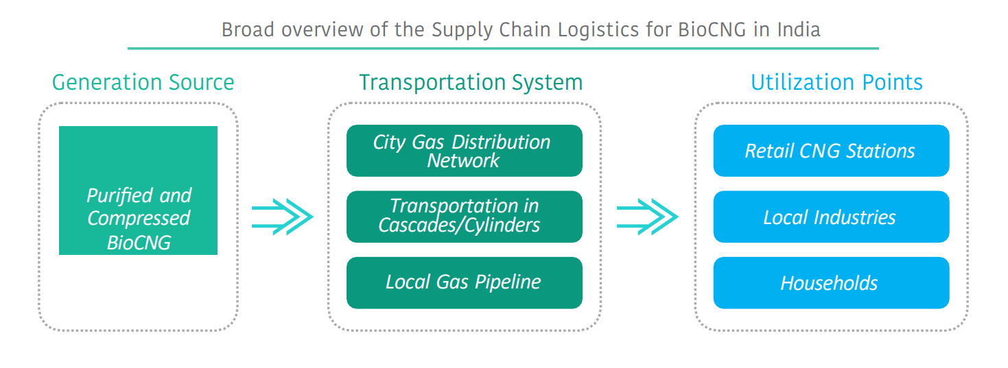 BioCNG can be injected in the CGD network (including PNG network) in specified geographical areas as per standards and protocol. At the utilization points of BioCNG i.e. Retail Outlet/ Standalone Selling Point, there is a requirement to create the infrastructure such as equipment for dispensing the BioCNG. The dispensing equipment will be installed and maintained by one of the CGD company, whereas, the BioCNG nozzles will be staffed and operated by CGD Company or its authorized service representative. A broad overview of the supply chain logistics for BioCNG in India is given below