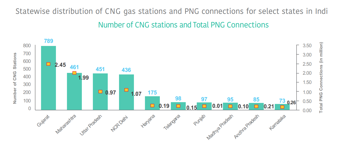 India has more than 3143 CNG gas stations nationwide. India also has ~8 million PNG connections in domestic, commercial, and industrial categories with 99.4% connections alone in domestic segment. Figure 16 highlights the statewise distribution of CNGgasstations andPNGconnections for select states in India23.