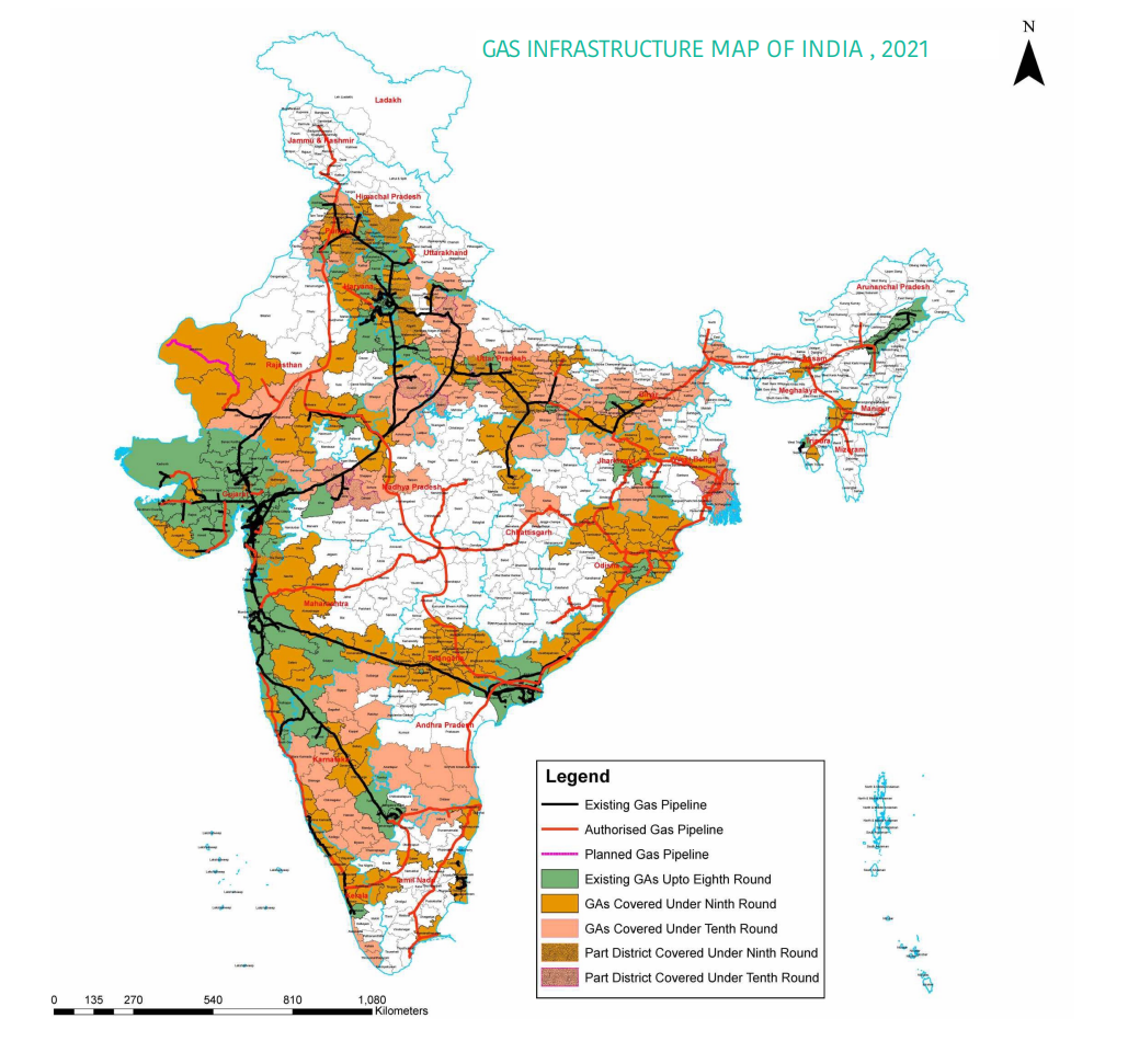 India has ~19,998 km long natural gas transportation pipeline (also called CGD network) across India. This large CGD network covers over 402 districts across 27 states and union territories in India and has a potential to cover 53% of country’s area and 71% of country’s population21. Figure 15 presents the details of gas infrastructure in India22.