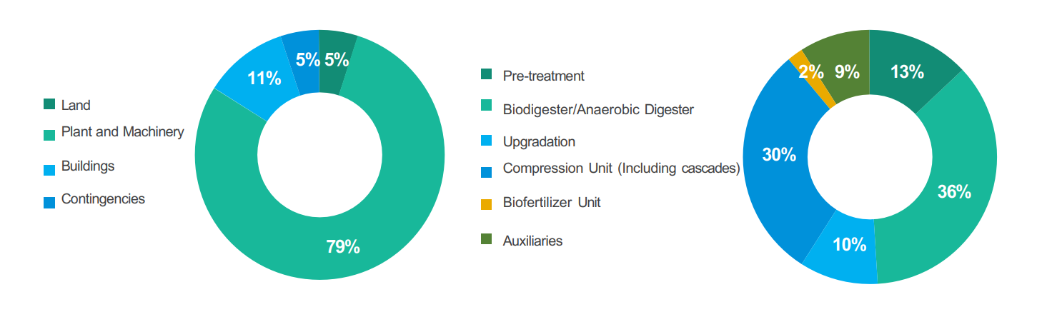 It has been estimated that the plant and machinery costs contributes ~76% of CAPEX and varies with BioCNG production capacity, pre treatment requirements, type of technology used for upgradation etc. A broad overview of the CAPEX cost for an 8-10 TPD BioCNG project in India is given below