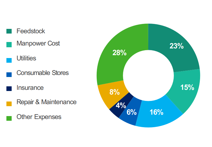 OPEX cost basically includes electricity cost, water cost, consumables cost, manpower cost, repairs and maintenance cost, administrative overheads and raw materials/feedstock cost.