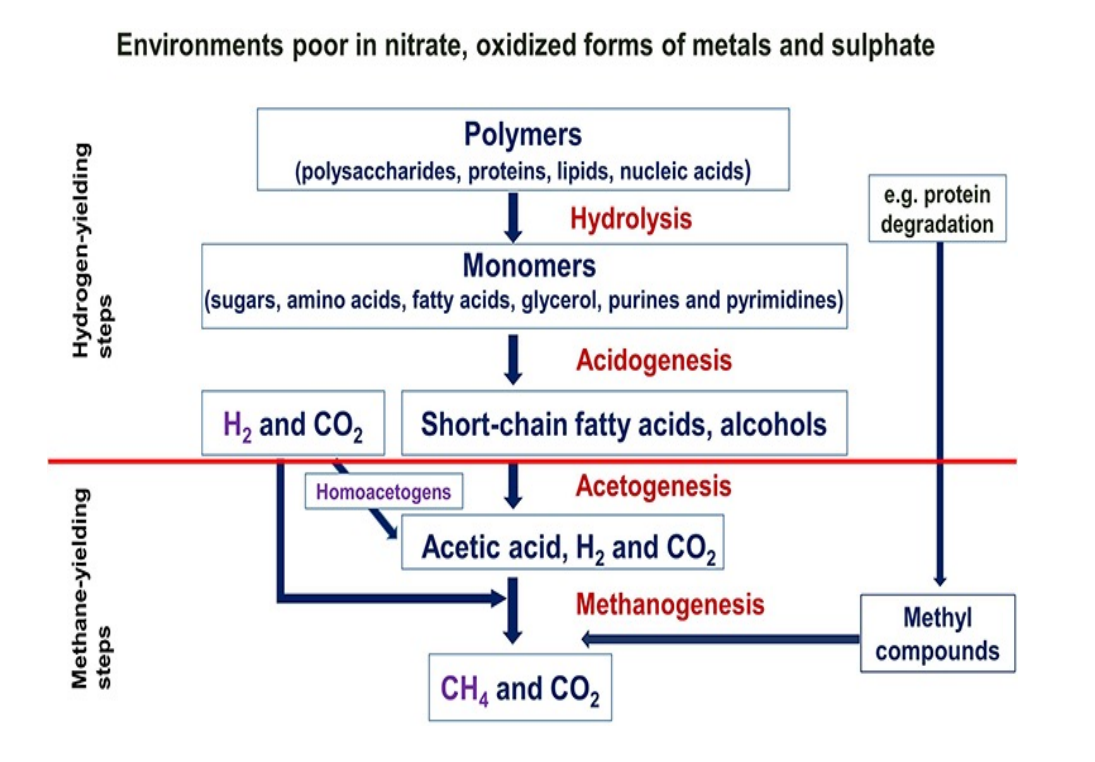 Some products, such as CO2, H2, acetate, and formats, are readily usable by the methanogens at the last stage.