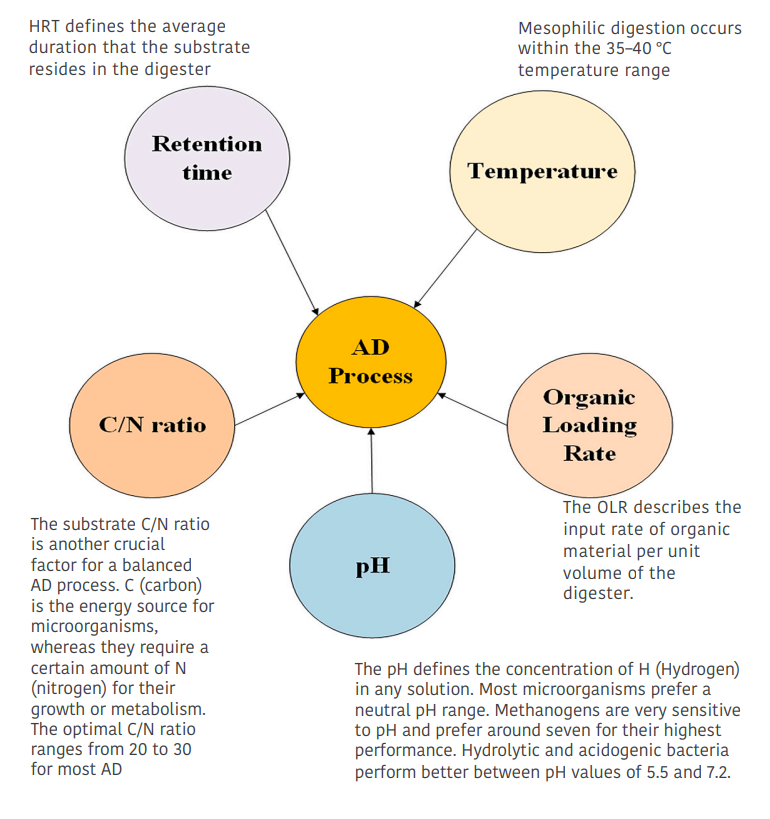 AD bacteria are sensitive to several process conditions. Some critical process parameters are temperature, pH, organic loading rate (OLR), hydraulic retention time (HRT), C/N ratio, etc., as shown below. Based on the feedstock properties and
