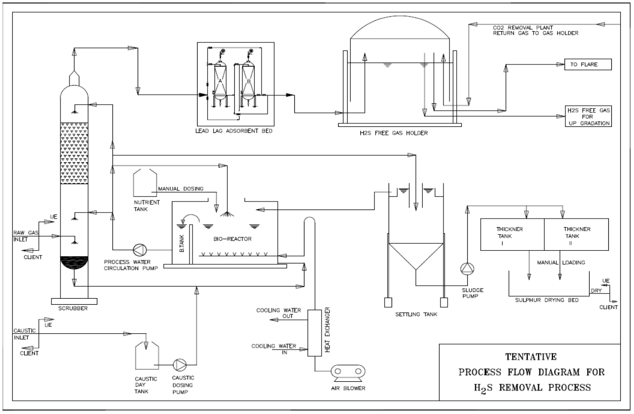 Equipment required: Caustic as per H2s Content in the Raw Material, Scrubbing Tower, Pumps, Biological Culture and Catalyst for Absorption Vessel. Various instrumentations and Instrument Air Compressor