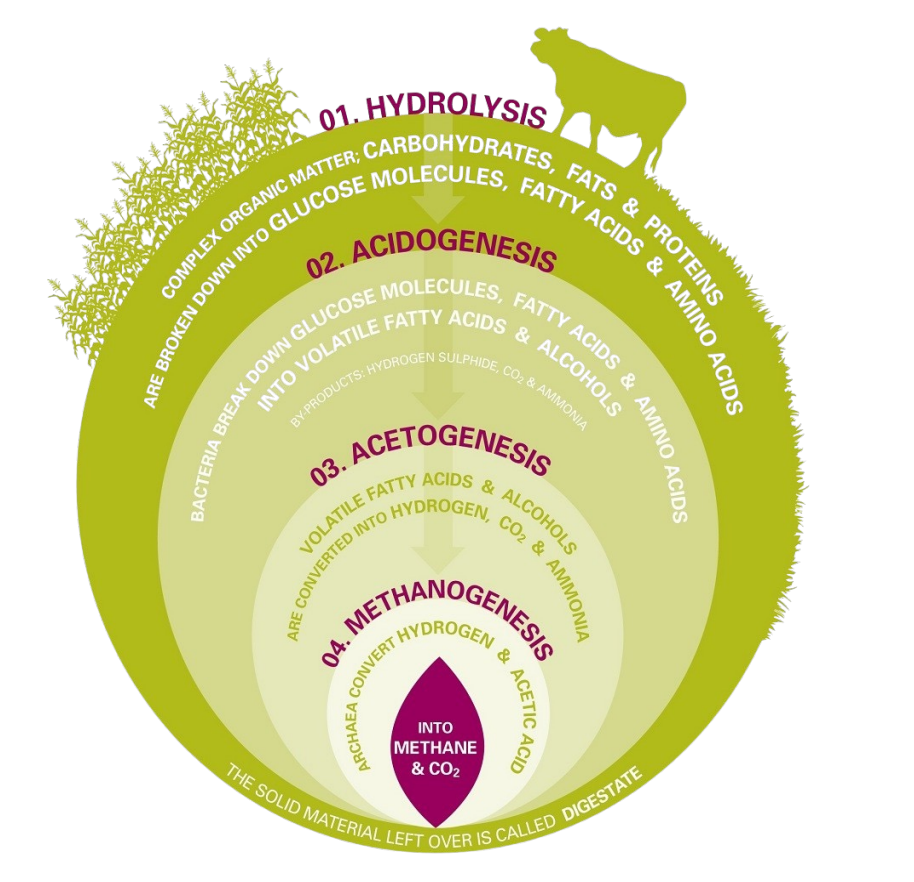 | Acidogenesis | Following hydrolysis, bacteria convert glucose derivatives, fatty acids and amino acids into volatile fatty acids (VFAs) and alcohols. |